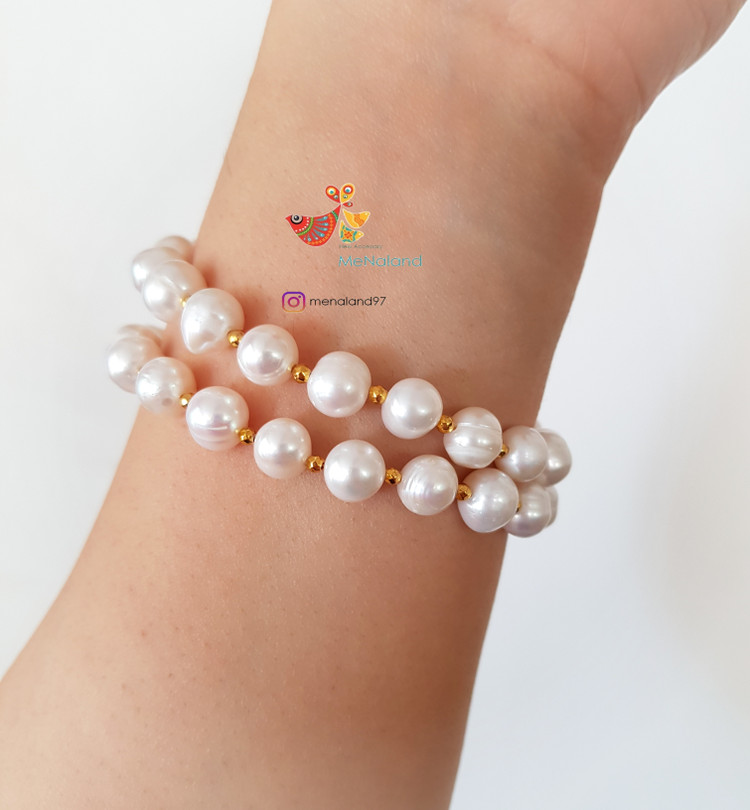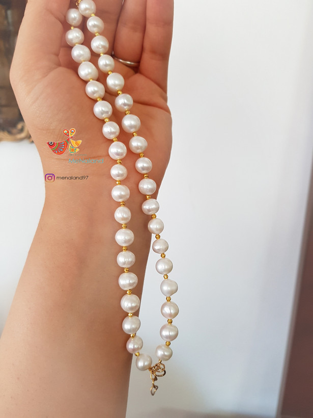 مروارید پرورشی سایز ۸ درجه ۱ و اصل با مهره های طلایی حدید و قفل ملوانی استیل